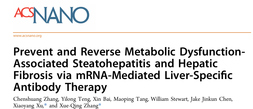 2024年12月05日,上海交通大学章雪晴团队与新泽西理工学院许晓阳团队在期刊《ACS Nano》上发表题为" Prevent and Reverse Metabolic Dysfunction Associated Steatohepatitis and Hepatic Fibrosis via mRNA Mediated Liver-Specific Antibody Therapy "的研究论文。