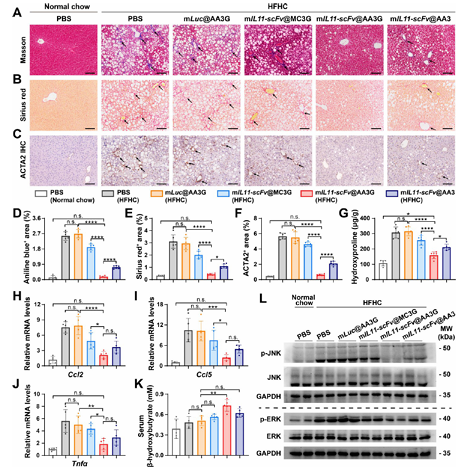 高剂量(0.6 mg/kg)mIL11-scFv@AA3G可显著减少肝细胞脂滴、降低肝甘油三酯含量;大幅减少胶原沉积,纤维化程度接近正常小鼠;血清ALT、AST水平基本恢复正常,疗效优于游离抗体和商用载体。