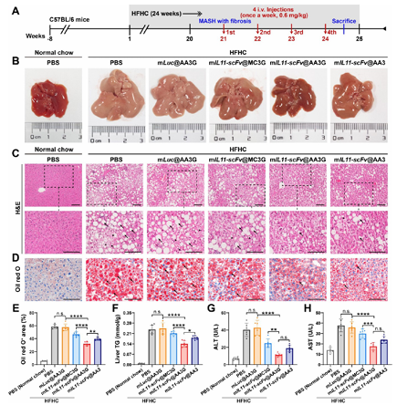 3 该疗法在MASH模型中疗效优于市售LNP及游离抗体,且安全性良好,为MASH治疗提供新型策略。