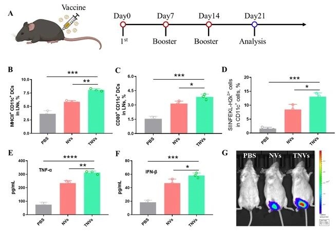 随后,ag尊龙凯时在体内环境中验证纳米疫苗的免疫调节效果,体内转染实验显示TNVs局部表达效率更高,经三次肌肉注射免疫后,小鼠腹股沟淋巴结中成熟DC比例、抗原交叉呈递效率及血清促炎细胞因子水平均显著提升,证实靶向疫苗在体内仍能高效激活免疫应答。