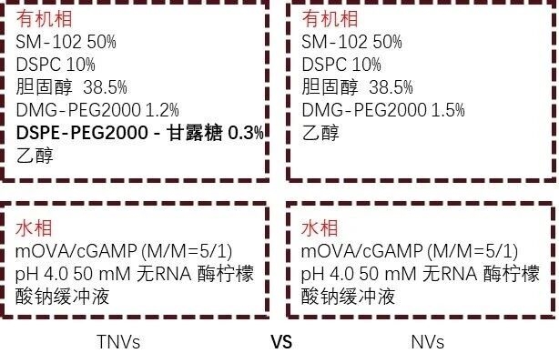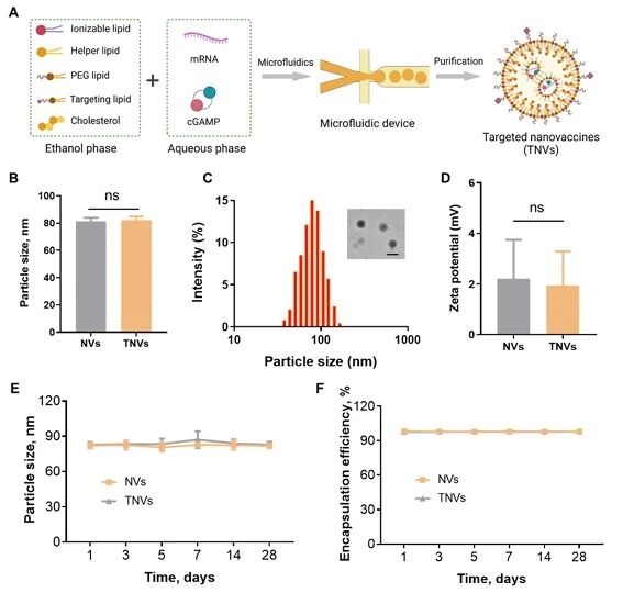 首先,研究团队通过微流控技术制备了非靶向(NVs)与靶向(TNVs)两种纳米疫苗,并完成表征与稳定性验证,结果显示二者粒径均为80-85nm、PDI:0.05-0.09,呈均一球形,mRNA包封率超97%,且4℃储存在28天内性能稳定,为后续实验提供了合格的载体基础。