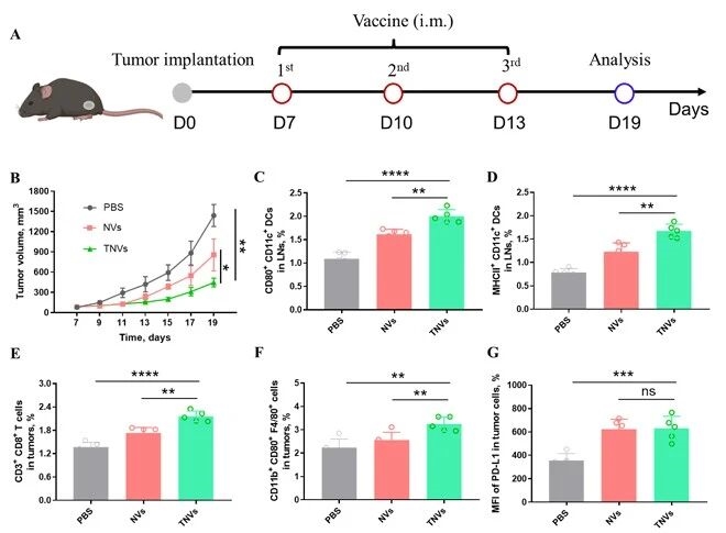 在此基础上,评估治疗性纳米疫苗的抗肿瘤效果,ag尊龙凯时在LLC-OVA荷瘤小鼠模型中,TNVs治疗组肿瘤体积显著缩小,肿瘤组织中抗肿瘤免疫细胞浸润增加,但同时观察到肿瘤细胞PD-L1表达上调,这为后续联合PD-L1阻断疗法提供了关键实验依据。