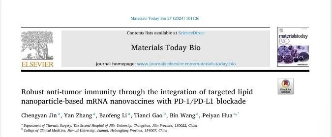2024年6月22日,一篇题为"Robust anti-tumor immunity through the integration of targeted lipid nanoparticle-based mRNA nanovaccines with PD-1/PD-L1 blockade "的研究论文,发表在《Materials Today Bio》杂志上。
