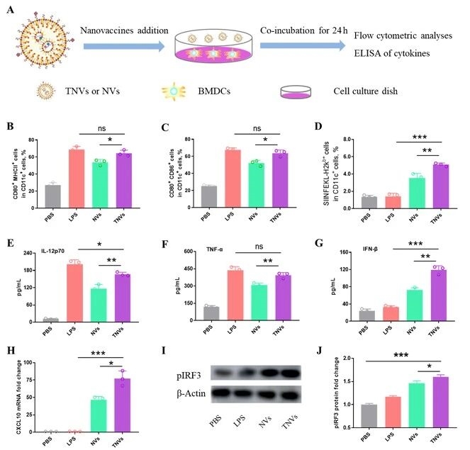其次,进一步分析纳米疫苗对BMDCs的免疫调节作用,结果表明TNVs能更有效地促进APC成熟、增强抗原交叉呈递能力,同时通过cGAMP激活STING-IRF3通路,显著上调IL-12p70、TNF-α等细胞因子分泌,验证了疫苗在体外的免疫激活潜力。